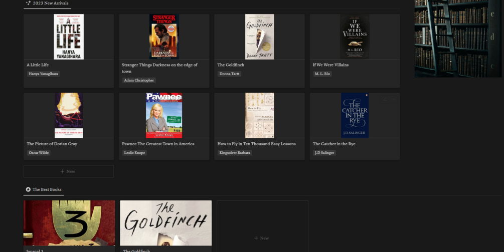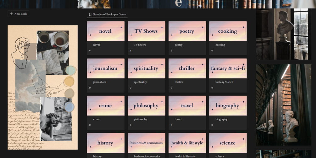 Fully functional Notion Template including database of your books, section of you best rated books, section of books divided by genres, books with status of reading, aesthetic layout